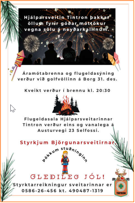 Hjálparsveitin Tintron mun standa fyrir áramótabrennu og flugeldasýningu við golfvöllinn á Borg 31. desember.