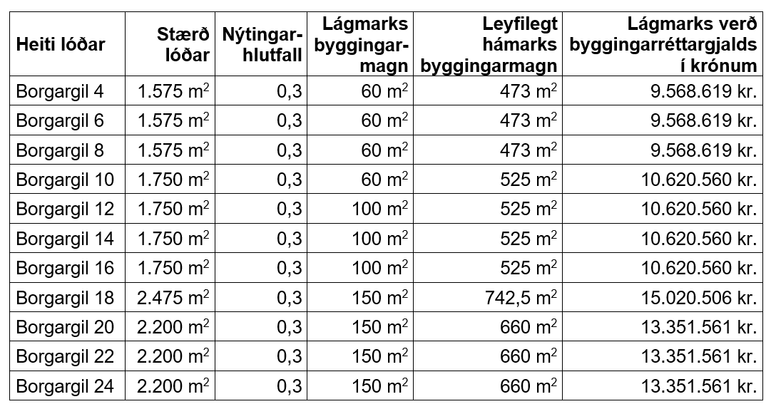 Eftirfarandi lóðir eru í boði ásamt lágmarksverði.
