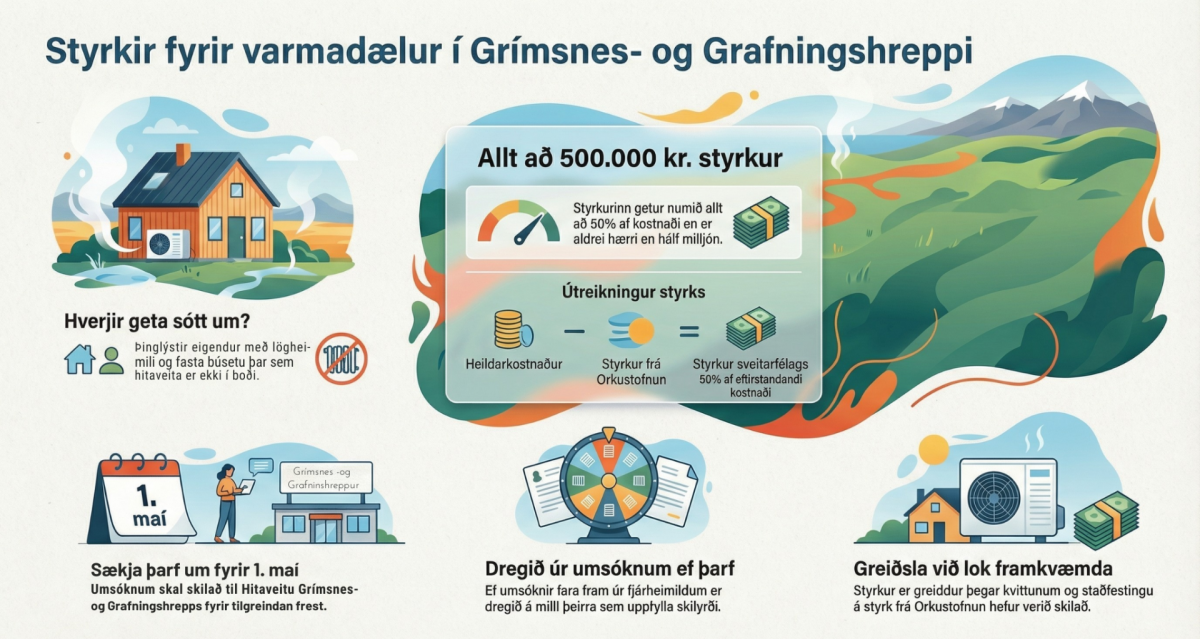 Sveitarstjórn Grímsnes- og Grafningshrepps hefur samþykkt reglur um fjárstyrki til eigenda fasteigna vegna varmadælna. Markmiðið með styrkveitingunum er að styðja við íbúa á svæðum þar sem hitaveita er ekki tæknilega eða fjárhagslega hagkvæm og hvetja til aðgerða sem draga úr notkun raforku til upphitunar á íbúðarhúsnæði.