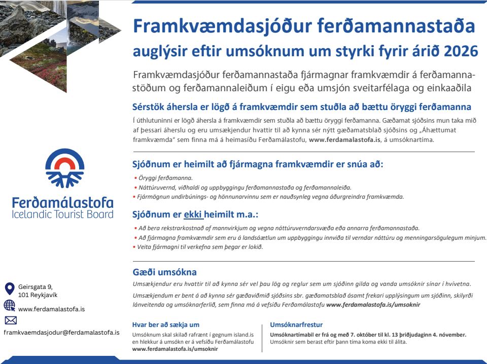 Framkvæmdasjóður ferðamannastaða auglýsir hér með eftir umsóknum um styrki fyrir árið 2026.