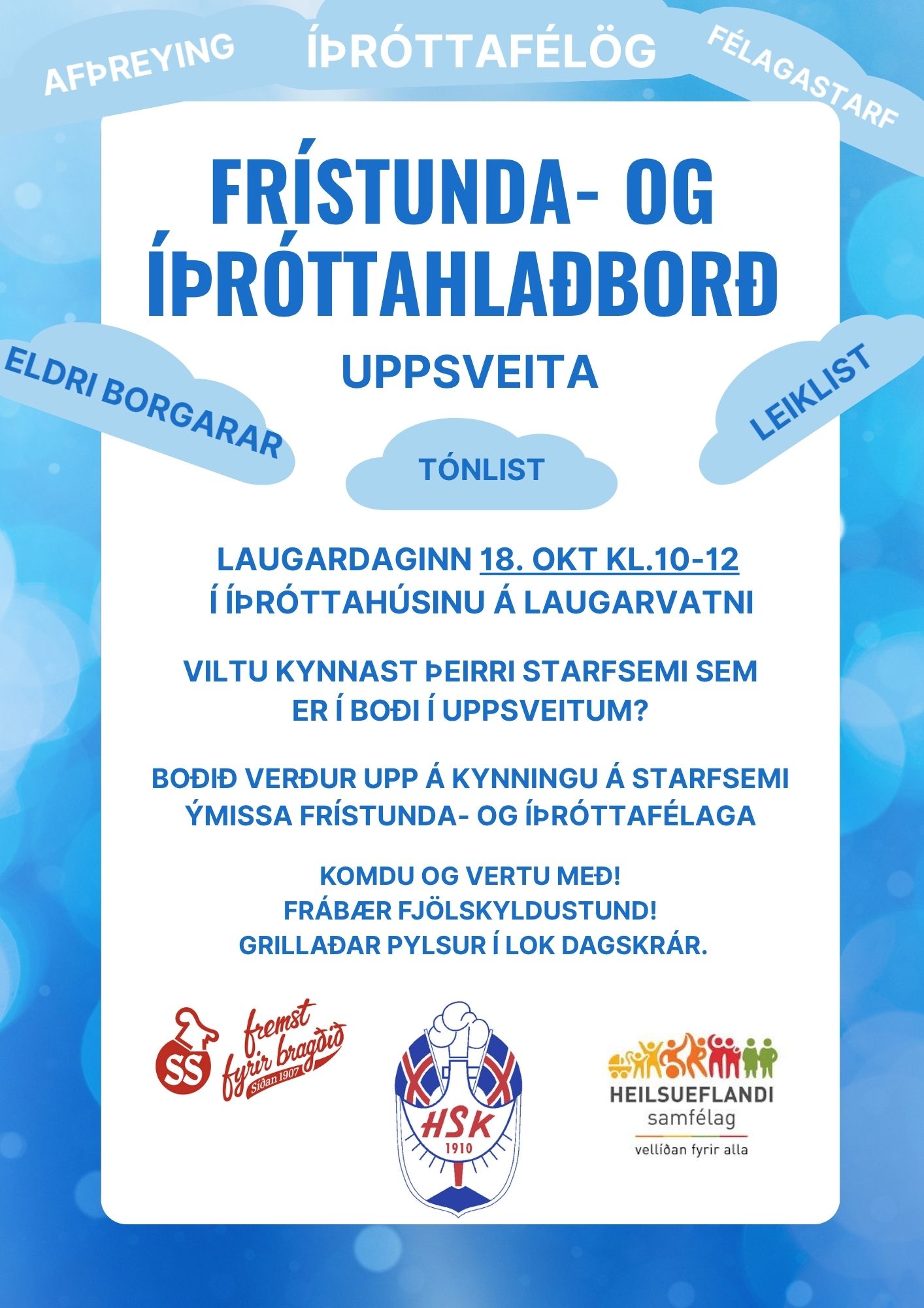 Frístundar- og Íþróttahlaðborð verður haldið á laugardaginn 18. okt kl.10-12 í íþróttahúsinu á Laugarvatni. Boðið verður upp á kynningu á starfsemi ýmissa frístunda- og íþróttafélaga.
