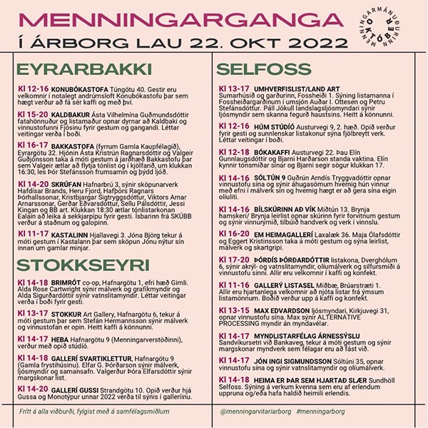 Yfir 30 listamenn opna vinnustofur og gallerý víða í sveitarfélaginu, sjá auglýsingu hér að ofan. Samsýningar eru í Fossheiðargarðinum hjá Sumarhúsinu og garðinum, Listagalleríinu og sundlauginni á Selfossi, í Skrúfunni á Eyrarbakka og Brimrót Co up á Stokkseyri. Listafólk Árborgar að opna vinnustofur sínar og gallerí fyrir gestum og gangandi, leyfa fólki að líta við og skoða afrakstur sköpunar sinnar.Sjá dagskrá hér: Menningarmánuðurinn október 2022
