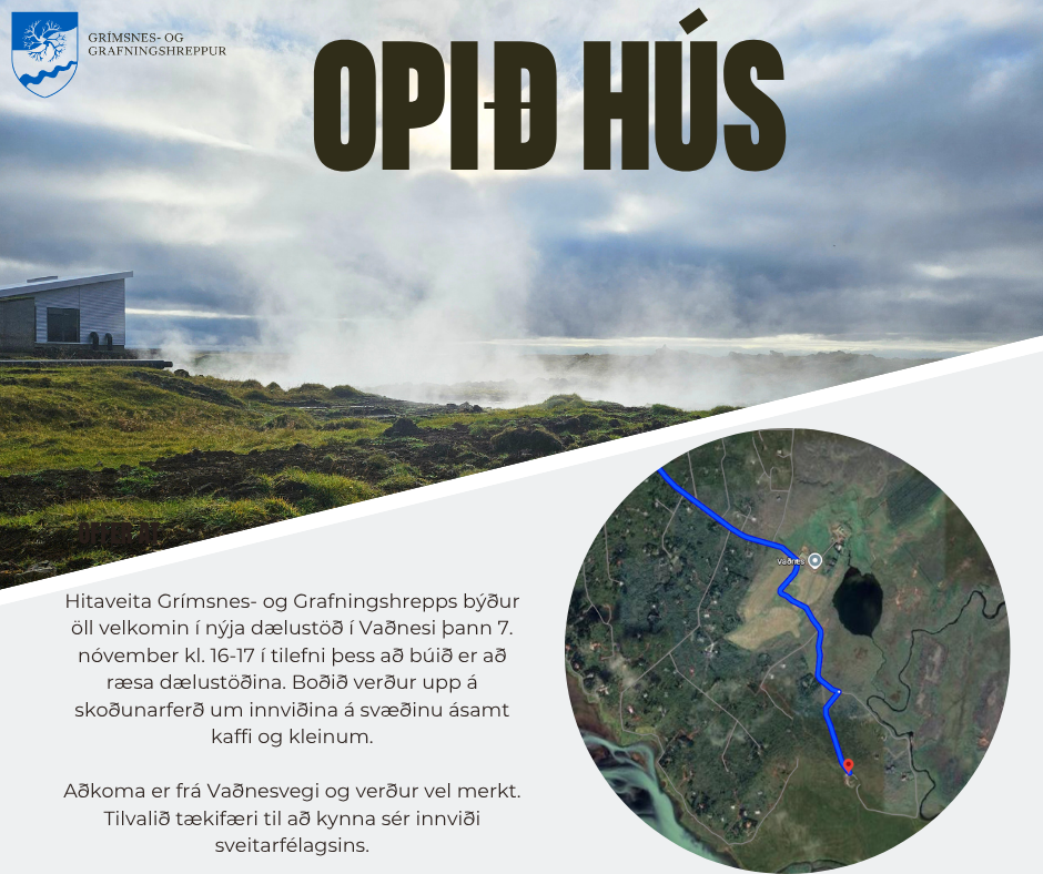 Hitaveita Grímsnes- og Grafningshrepps býður öll velkomin í nýja dælustöð í Vaðnesi þann 7. nóvember kl. 16-17 í tilefni þess að búið er að ræsa dælustöðina. Boðið verður upp á skoðunarferð um innviðina á svæðinu ásamt kaffi og kleinum.