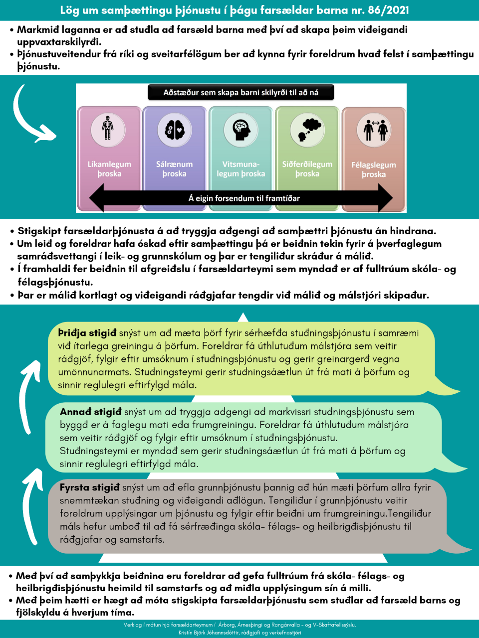 Til að stuðla að samþættri þjónustu í þágu farsældar barna þá þurfa þjónustukerfin að vinna saman að lausnum og fjarlægja hindranir. Tryggja þarf gott aðgengi að faglegri leiðsögn sem styður við víðsýni og byggir upp traust. Þannig er hægt að móta þjónustu sem er í takt við stuðningsþörf á hverjum tíma. Til að koma í veg fyrir rof í þjónustu þarf verklag við skipan tengiliða og málstjóra að vera skilvirkt og jafnframt nauðsynlegt að skerpa á hlutverkum fulltrúa í stuðningsteymi við gerð stuðningsáætlunar.