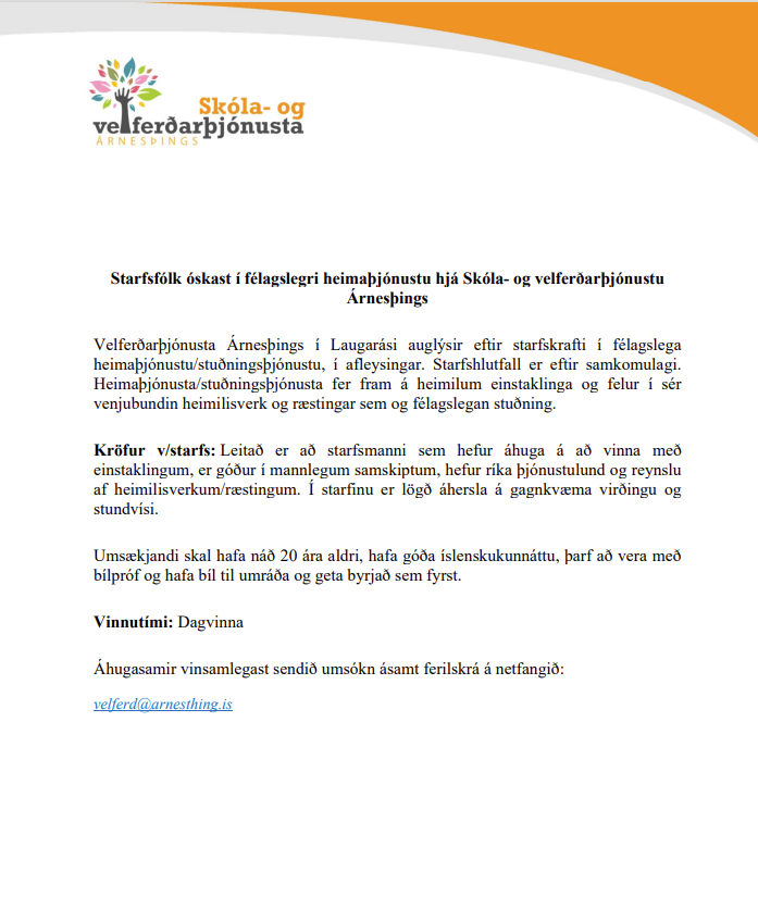 Starfsfólk óskast í félagslega heimaþjónustu hjá Skóla- og velferðarþjónustu Árnesþings