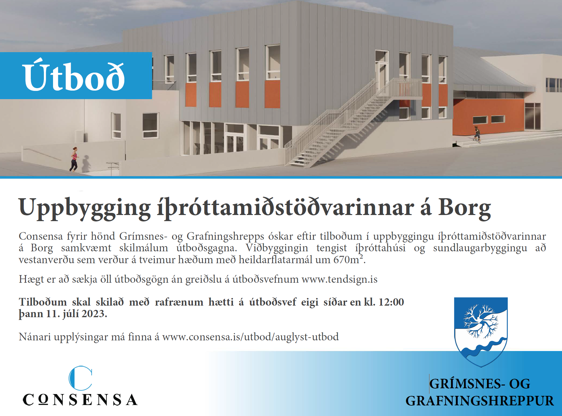 Consensa fyrir hönd Grímsnes- og Grafningshrepps óskar eftir tilboðum í uppbyggingu íþróttamiðstöðvarinnar á Borg samkvæmt skilmálum útboðsgagna. Viðbyggingin tengist íþróttahúsi og sundlaugarbyggingu að vestanverðu sem verður á tveimur hæðum með heildarflatarmál um 670m². Á 1.hæð viðbyggingar mun vera líkamsræktaraðstaða, sjúkraþjálfun ásamt stoðrýmum en á 2.hæð verða skrifstofurými og stoðrými. Gert er ráð fyrir að hvor hæð fyrir sig geti starfað sem sjálfstæð rekstrareining með aðgengi um sameiginlegan inngang, stigahús og lyftu á milli hæða.