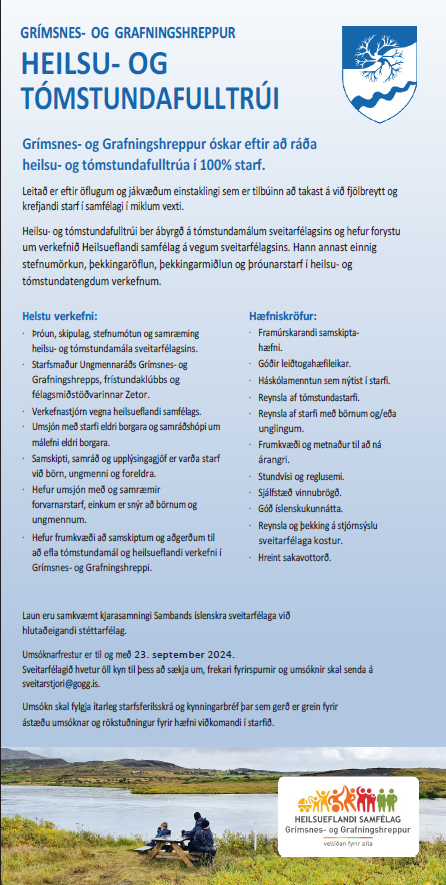 Sveitarfélagið Grímsnes- og Grafningshreppur auglýsir eftir heilsu- og tómstundafulltrúa