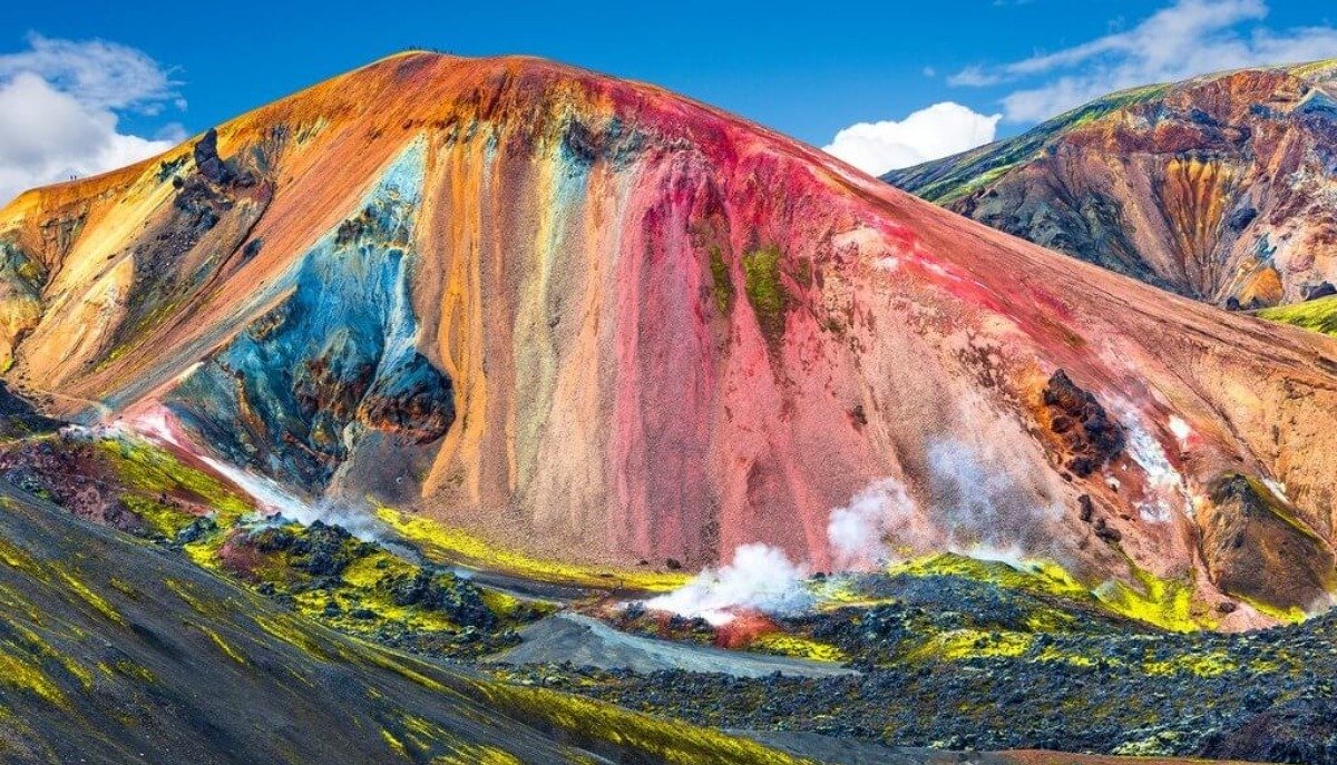 Landmannalaugar er svæði sem samanstendur af mismunandi og samankomnum jarðfræðilegum þáttum, svo sem víðáttumiklum hrauni og marglituðum fjöllum. Böðum okkur í regnbogas litum, fjöllin gerð úr bleiku til brúnum og grænum litum, með skvettum gulum, bláum, fjólubláum og svörtum á milli.