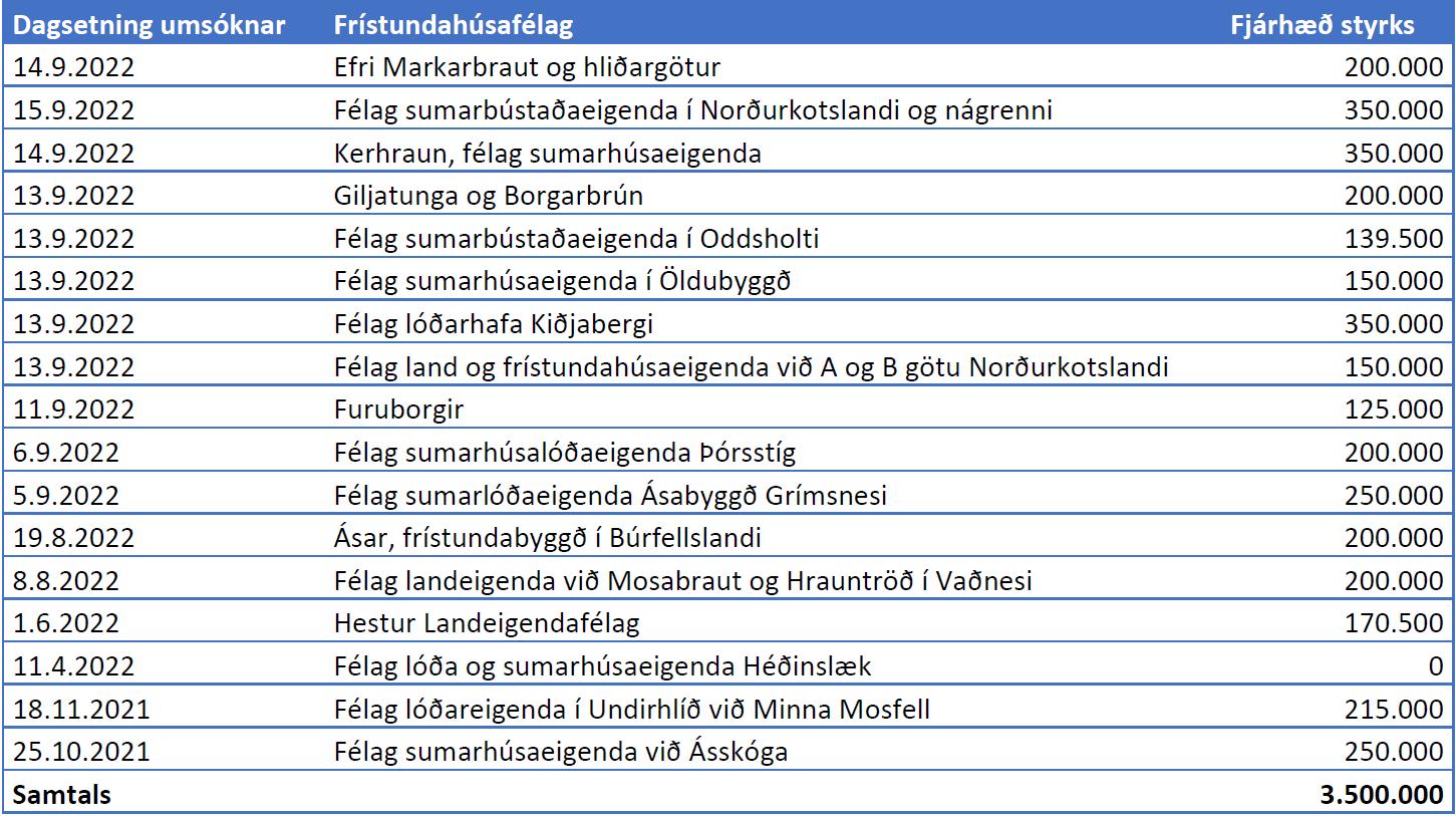 september 2021 – 15. september 2022. Eitt félag sótti um styrk vegna framkvæmda sem unnar voru utan styrkveitingartímabils og því uppfyllir það ekki skilyrði fyrir styrkveitingu.